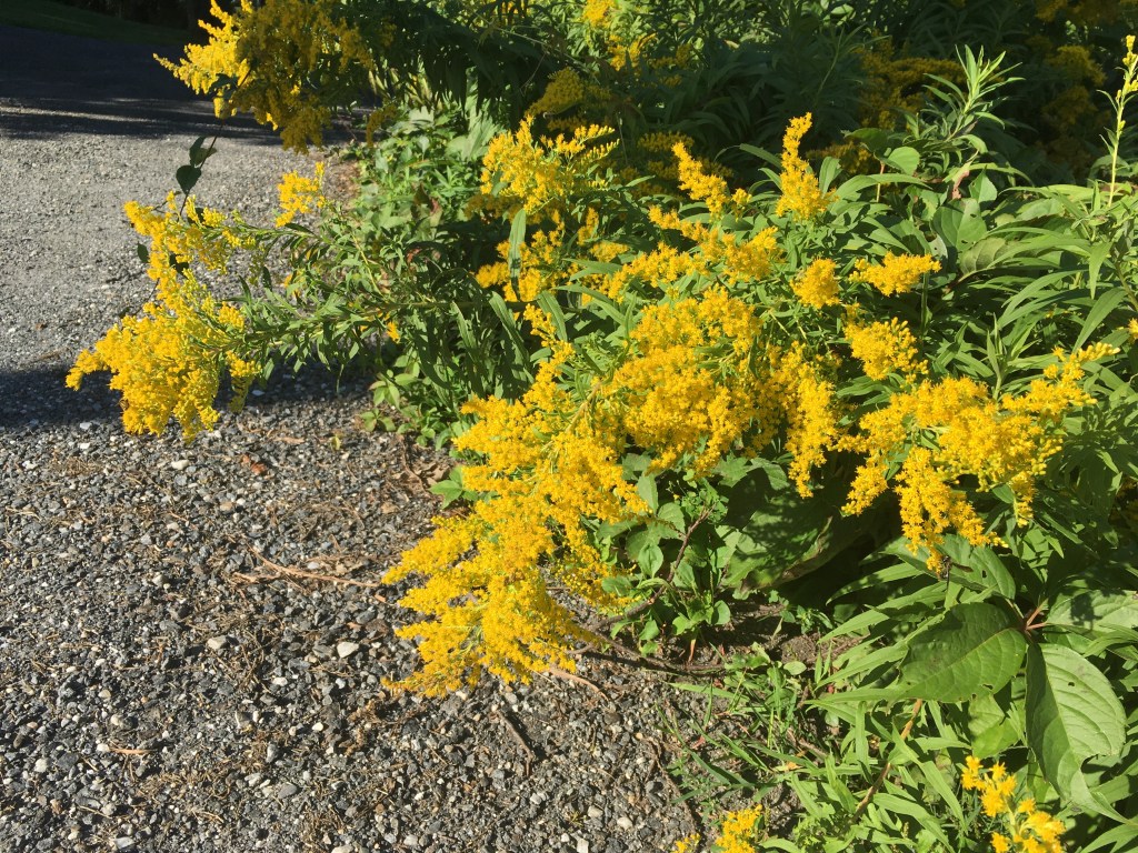 Two plants dominate my world in late summer, goldenrod (the beautiful) and ragweed (the terrible). Goldenrod is one of the showiest flowers to bloom all year, with bright yellow flowers that appear just at the edge of late summer and early fall. These tall narrow plants with their showy plume of flowers grow best in ‘disturbed’ habitats, which means they are found in areas we generally think of as underdeveloped or neglected. Roadside edges, unused fields and vacant lots all turn a glorious bright yellow in late August or early September, and the color lingers usually until the first real frost of fall. I love goldenrod, how its brilliant yellow appears against the dark green leaves of deep summer, and how that brilliance persists even as the green in those leaves is replaced by yellows, oranges, reds and browns.