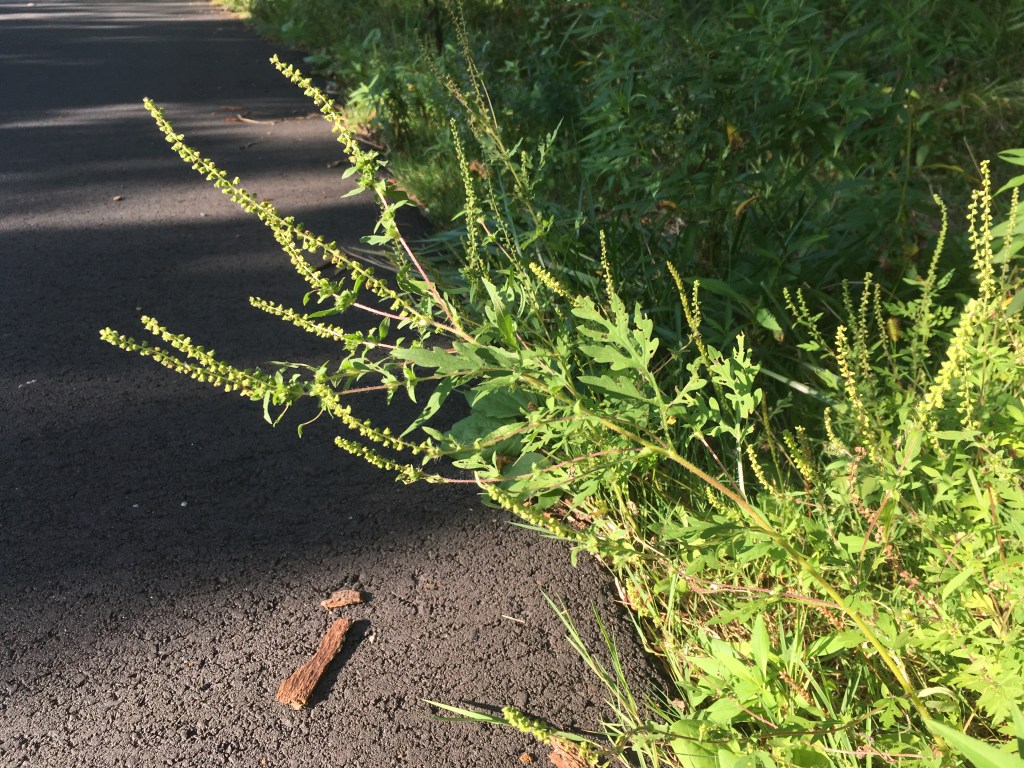Ragweed flowers are inconspicuous, being the same green color as the plant’s leaves and stem. Like goldenrod, ragweed flowers are tiny and cluster together into long plumes at the ends of its upper stems (picture). Unlike goldenrod, which relies on animals to pollinate it, ragweed flowers release pollen into the air, allowing wind to carry pollen from one plant to the next. Wind is a dubious pollinator; a grain of wind-carried ragweed pollen is much less likely to reach an available ragweed flower than a grain of goldenrod pollen hitching a ride from one flower to the next on the leg of a bumblebee. To make up for this uncertainty, ragweed flowers produces copious amounts of pollen, up to 1 billion pollen grains per plant, and those pollen grains can travel for hundreds of miles before they fall out of the air and onto hopefully (for the plant) a ragweed flower, or into (more likely) a person’s nose or eyes.