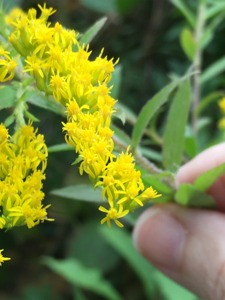 Each yellow plume of a goldenrod is actually made of many small individual flowers. In fact, each flower looks a bit like a tiny entirely yellow daisy. (picture) Goldenrods are a collection of different species in the genus Solidago, which is in turn a member of the Aster family (Asteraceae), a family which includes daisies, chrysanthemums, and unfortunately, the ragweeds. In New England alone we have over twenty different species of goldenrods each with its own particular habitat preferences (follow this link for more fun detail).